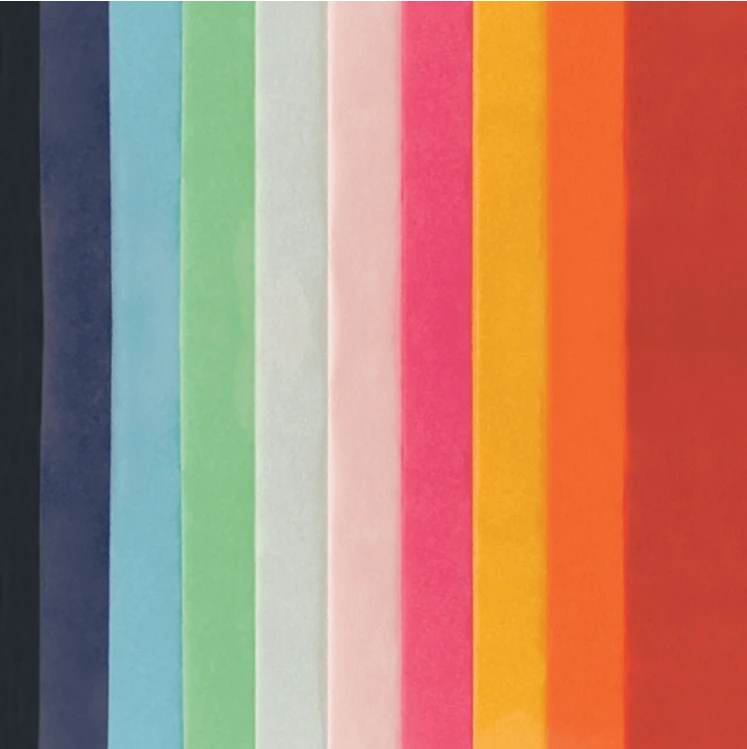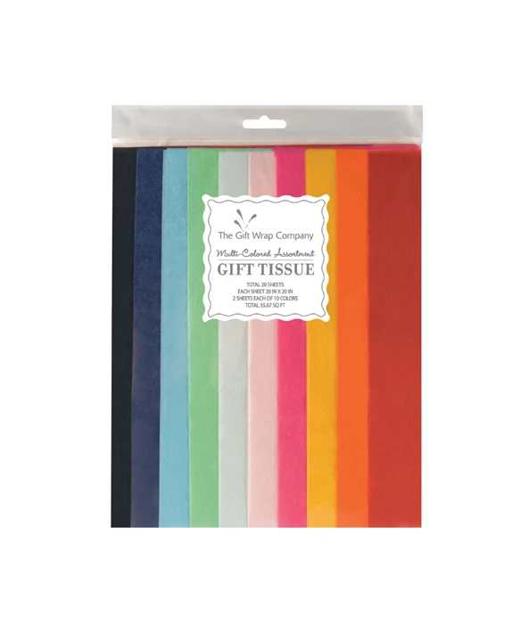 Twenty sheets per pack, two sheets each of ten colors, 20″ by 20″, 8.5″ by 11.5″.
