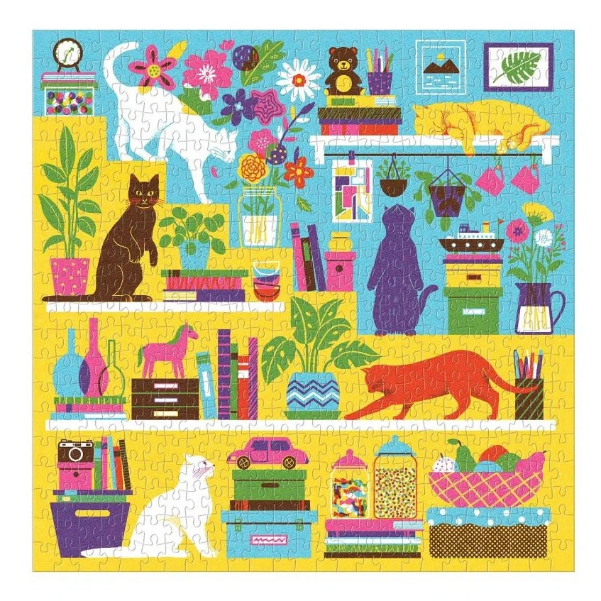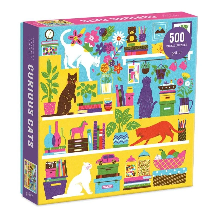 Piece together the Curious Cats 500 Piece Family Puzzle to reveal an array of our favorite feline pranksters! This amusing illustration is a great family activity for adults and children to enjoy together. Puzzle pieces come packaged in a sturdy and easy-to-wrap box, perfect for gifting, reuse, and storage.