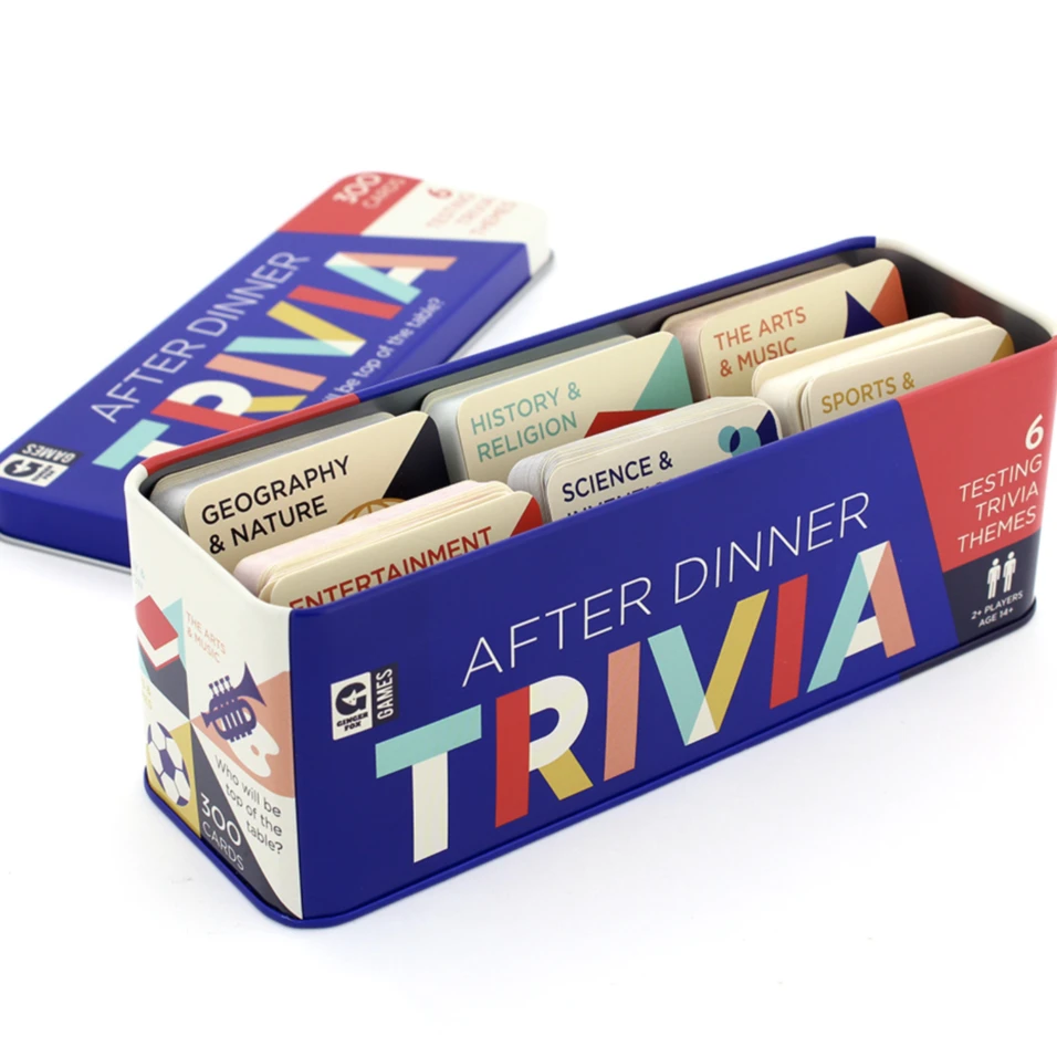 After Dinner Trivia includes 300 quiz cards covering 6 classic trivia categories; perfect for riotous after-dinner fun!
