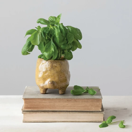 – This pot is an easy and adorable way to display faux or real plants. Made out of stoneware, this pot is in the shape of a cute turtle and has a mustard finish. This cute little friend is perfect for displaying any small plant in a unique fashion.