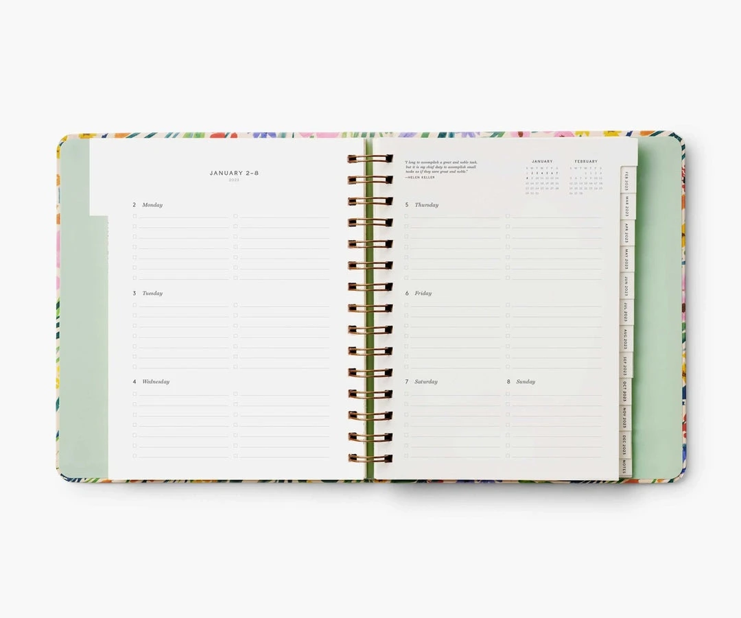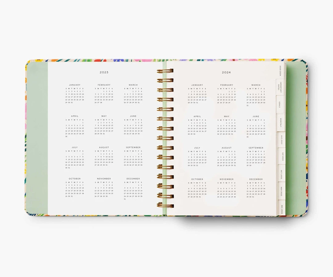 Start planning ahead with our 2023 17-month planners. A sturdy hard cover wraps over the interior spiral binding, and an elastic band holds the pages closed. Inside youโll find monthly and weekly views, inspirational quotes, sections for celebrations, notes and contacts, pocket folders for storage, and three sticker sheets for extra fun. Planners span August 2022-December 2023.