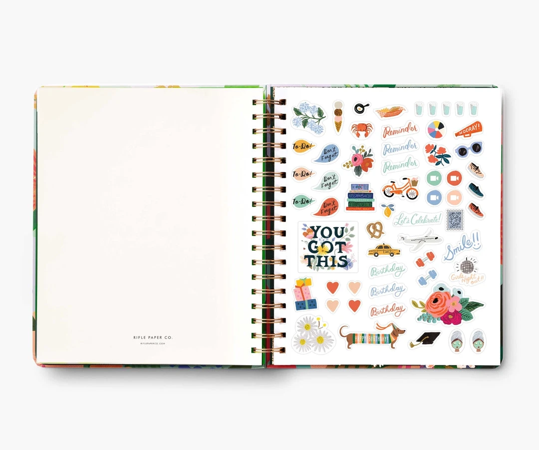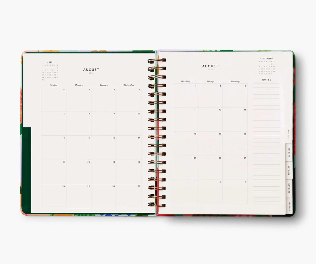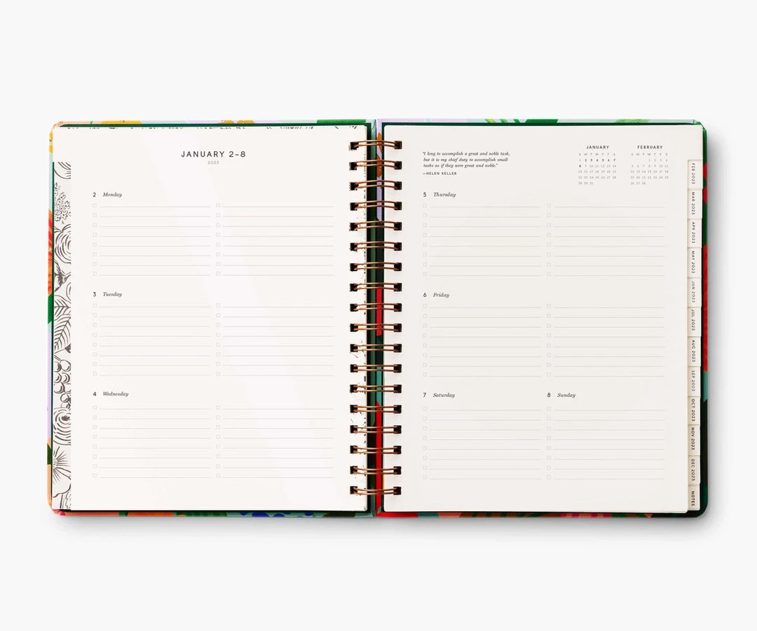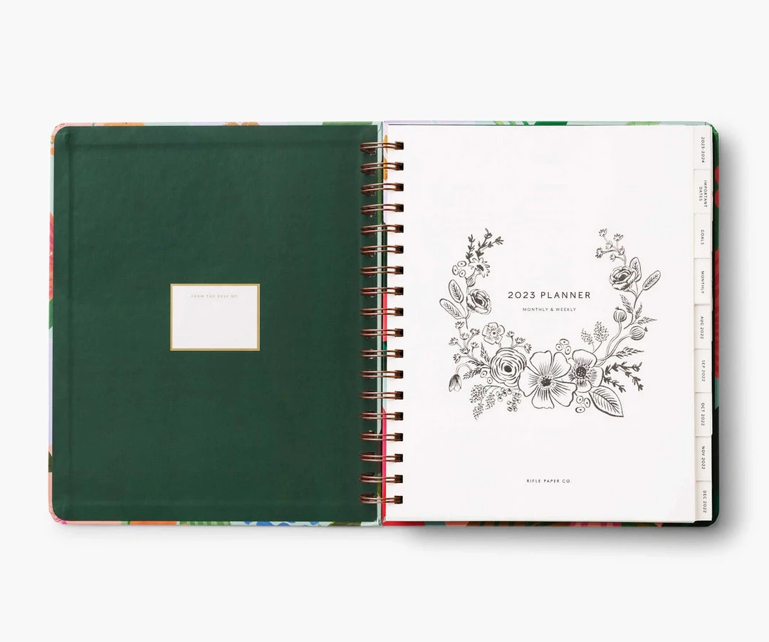 Start planning ahead with our 2023 17-month planners. A sturdy hard cover wraps over the interior spiral binding, and an elastic band holds the pages closed. Inside youโll find monthly and weekly views, inspirational quotes, sections for celebrations, notes and contacts, pocket folders for storage, and three sticker sheets for extra fun. Planners span August 2022-December 2023.
