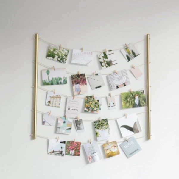 Create your personal photo collage using your special pictures and memories with this unique wall photo display. With its wooden clips, Hangit makes it easy to change out pictures or prints anytime. Forget the scissors and glue, and present your photos in a space where they can be enjoyed by many. Using the 40 mini ‘clothespin’ clips, attach your photos and mementos across 5 twine cords in a style that is uniquely ‘you’. With Hangit you can give your custom wall art a makeover and refresh your room décor any time you want by simply removing, adding or swapping photos thanks to the 40 removable mini clothespins and 5 twine cords. Hangit works perfectly in a dorm room, office, bedroom and more.