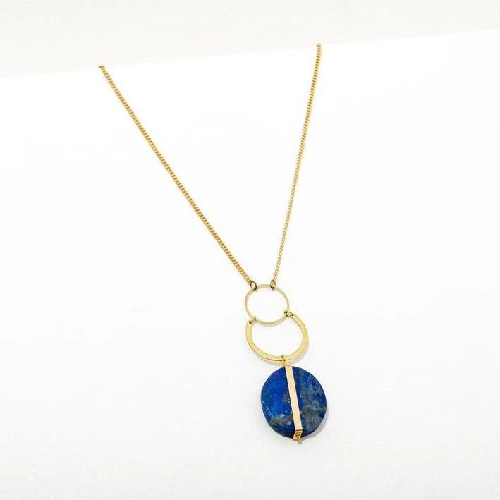 This necklace features a dreamy bezel-wrapped lapis gemstone pendant on a 30″ long electroplated gold/brass chain. It has no clasp (pull it over your head!) and the pendant drops about 3″. Natural lapis is known for its healing qualities.ย