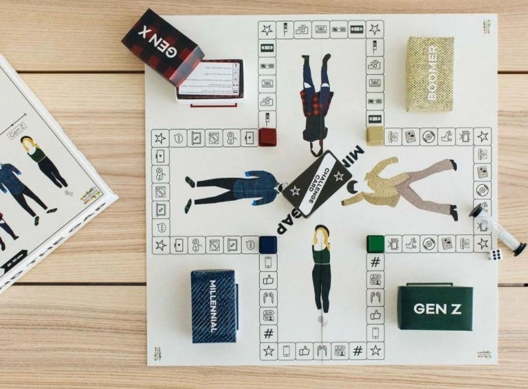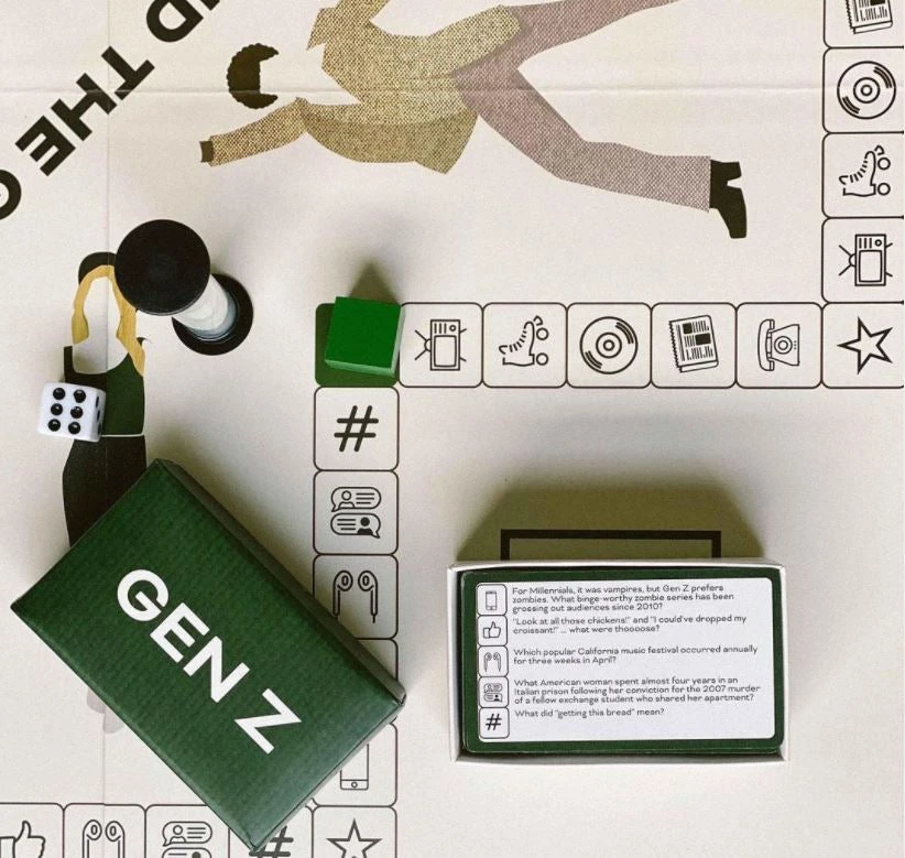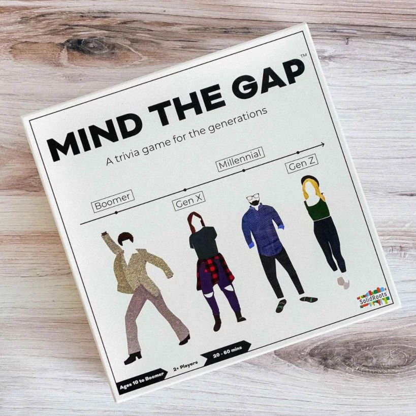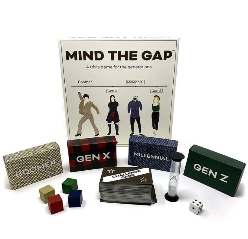In Mind the Gap, teams race around the board answering pop culture trivia through 4 generations: Boomer, Gen X, Millennial, & Gen Z. The team that makes it around the board first is crowned the Greatest Generation!