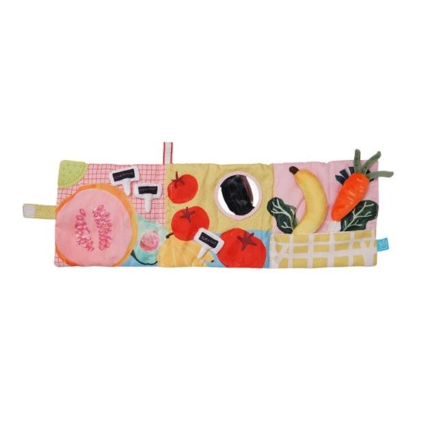 Soft textured fabrics for story-time fun and tummy-time play. The fruits and vegetable-themed soft activity book includes a variety of fabric textures for baby. Each page features colorful illustrations, soft textures and playful surprises. Activities include 3D cherries, textured teether corner, baby-safe discovery mirror and a basket pocket for storing tethered on crinkle carrot and banana.