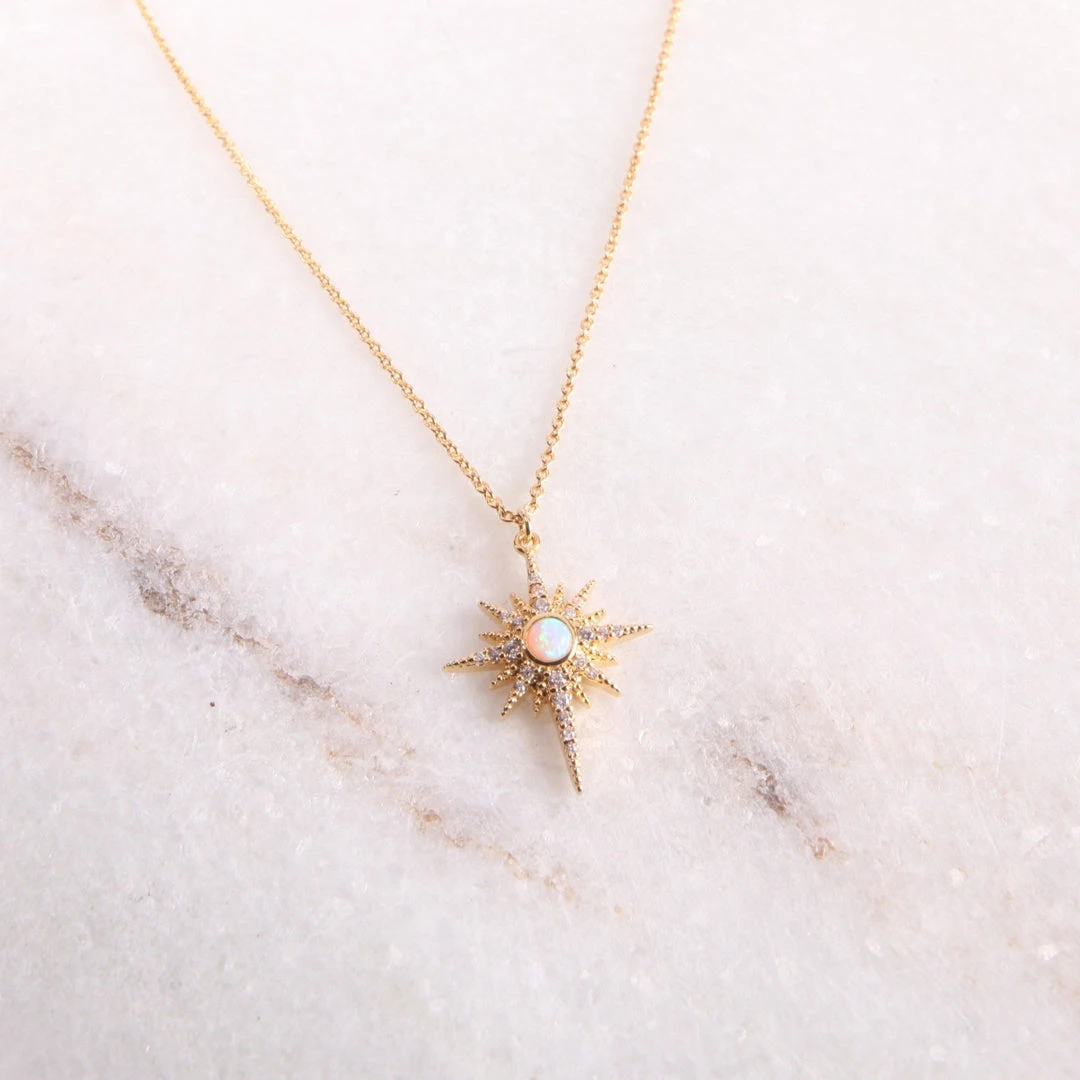 – Material: Gold plating over brass, Cubic Zirconia starburst charm with opal accents