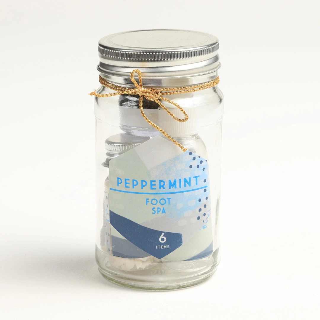 Peppermint Foot Spa Kit Includes: Foot Spray 40ml, Bath Salts 40ml, Body Lotion 40ml, Foot Scrub 10g, Foot Cream 10g, Cleansing Bar 15g