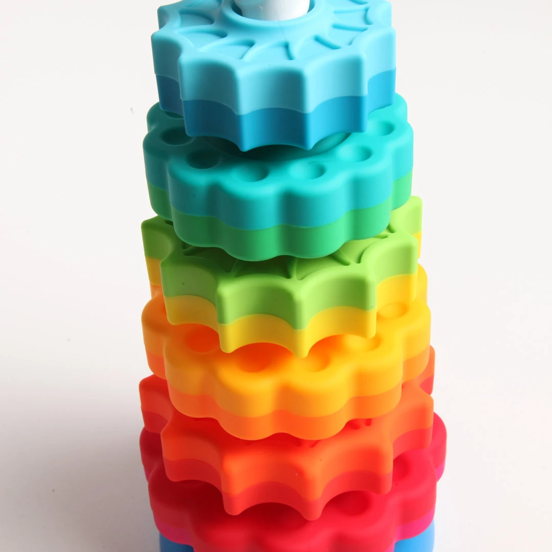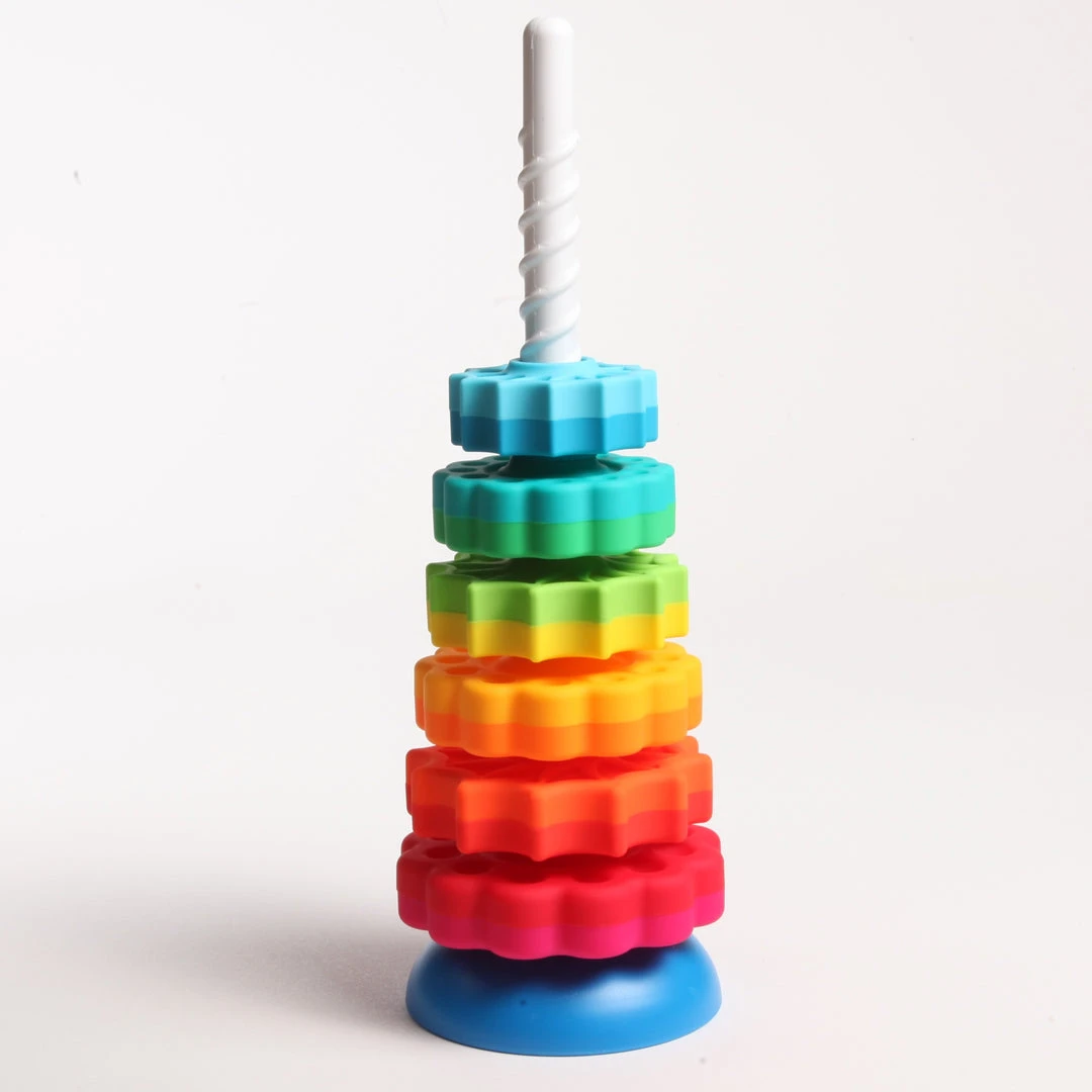 Drop the vibrant discs onto the threaded corkscrew pole and go ooooh as they spin fast and smooth to settle onto the reversible base.