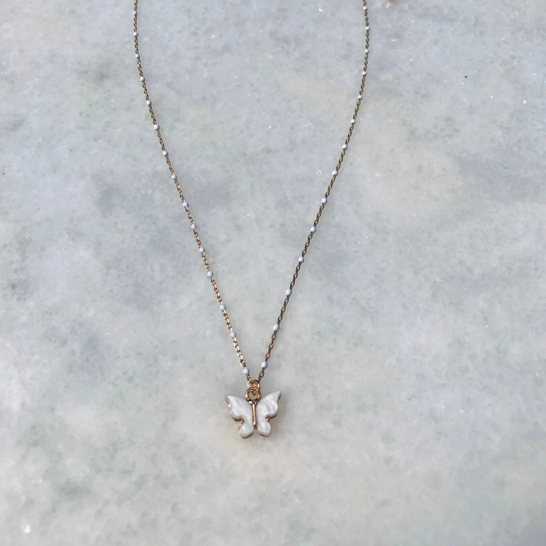 - Gold chain adorned with dainty white beads, and a white butterfly charm