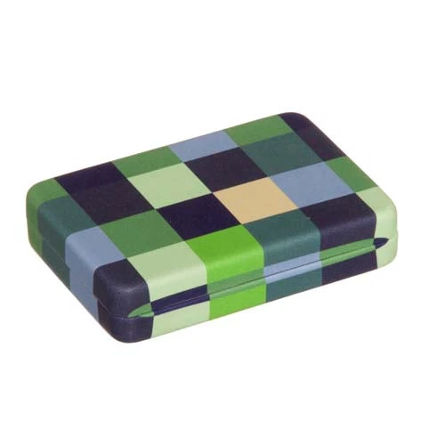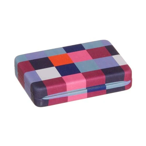 –ย Spring hinged case with colorful plaid faux leather exteriorย opens to reveal a compartmentalizedย interior with a mirror inside the lid.